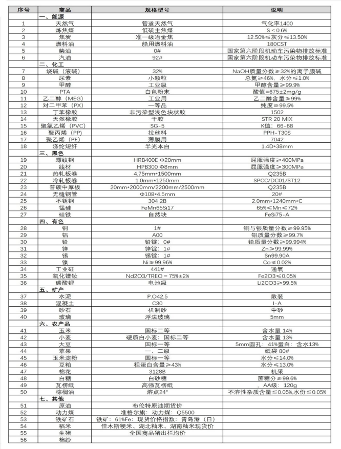 本表所示大宗商品價格(類別與產(chǎn)品規(guī)格說明見附表)為以人民幣計價的現(xiàn)貨價格(包含流通費用、利潤和稅費等)。計算這些價格時使用的信息來源,主要包括國內(nèi)重點地區(qū)的生產(chǎn)商、貿(mào)易商及下游消費企業(yè)之間的成交、詢報盤及可成交價格。價格單位為人民幣元/噸。