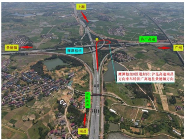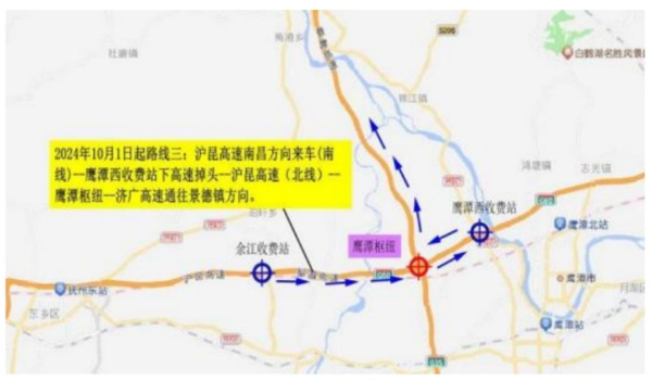 2024年10月1日起路線三:滬昆高速南昌方向來(lái)車(南線)--鷹潭西收費(fèi)站下高速掉頭--滬昆高速(北線)--鷹潭樞紐--濟(jì)廣高速通往景德鎮(zhèn)方向