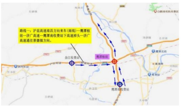 路線一:滬昆高速南昌方向來(lái)車(南線)--鷹潭樞紐一濟(jì)廣高速--鷹潭南收費(fèi)站下高速掉頭--濟(jì)廣高速通往景德鎮(zhèn)方向
