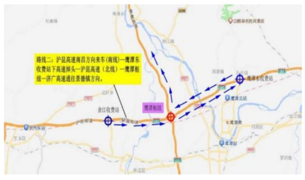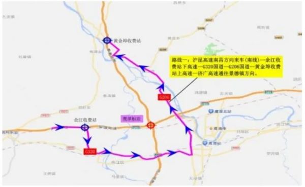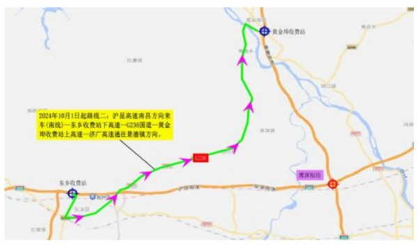 2024年10月1日起路線二:滬昆高速南昌方向來(lái)車(南線)--東鄉(xiāng)收費(fèi)站下高速--G236國(guó)道--黃金埠收費(fèi)站上高速--濟(jì)廣高速通往景德鎮(zhèn)方向