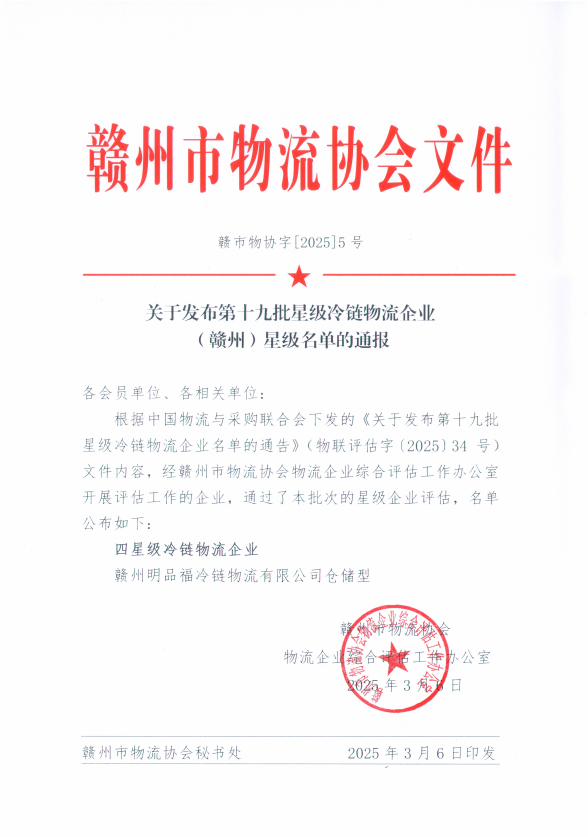 根據中國物流與采購聯合會下發的《關于發布第十九批星級冷鏈物流企業名單的通告》(物聯評估字〔2025〕34 號)文件內容,經贛州市物流協會物流企業綜合評估工作辦公室開展評估工作的企業,通過了本批次的星級企業評估,名單公布如下: