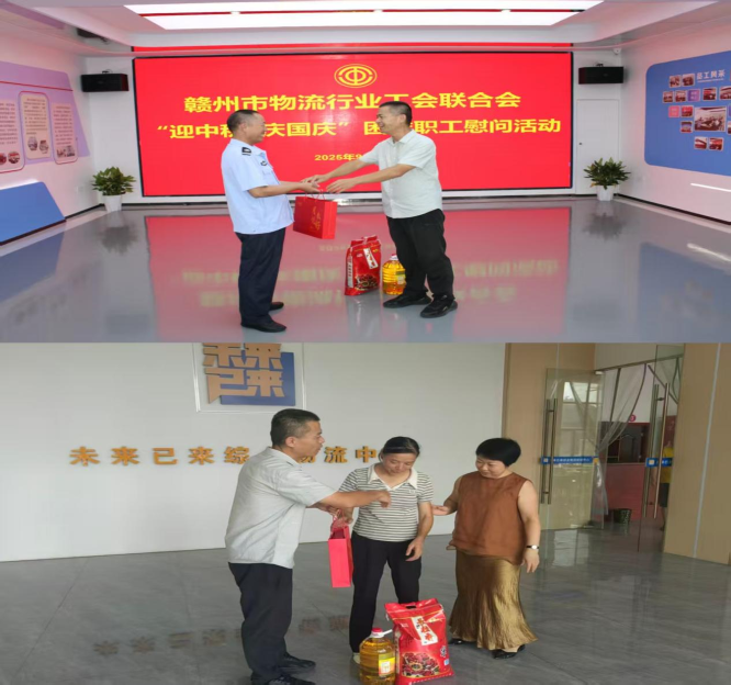 秋高氣爽,丹桂飄香。在中秋、國慶“雙節”即將到來之際,2025年9月29日,贛州市總工會蹲點組及贛州市物流行業工會聯合會工作人員一行,帶著濃濃的節日祝福和深深的關愛之情,先后來到未來已來物流園和德征物流園,走訪慰問奮戰在物流一線的困難職工,為他們送上節日的問候與慰問品。