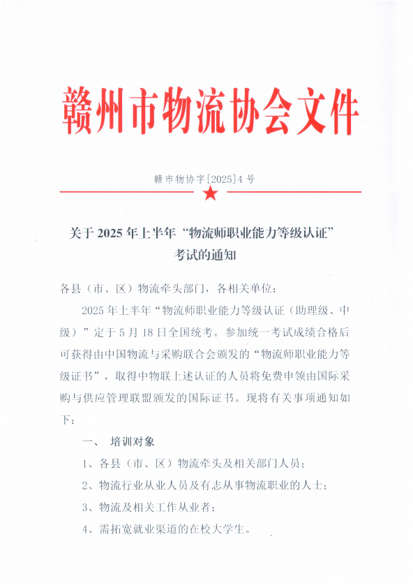 關于2025年上半年“物流師職業能力等級認證”考試的通知
