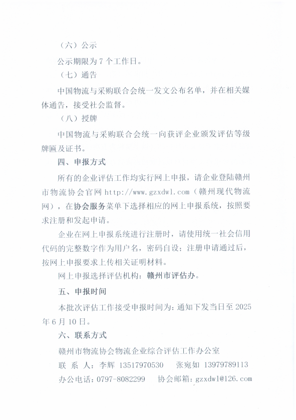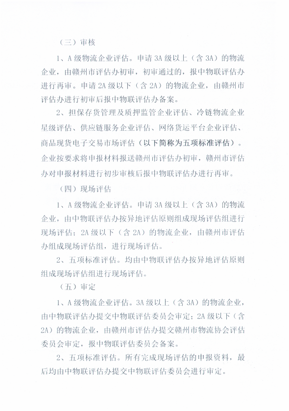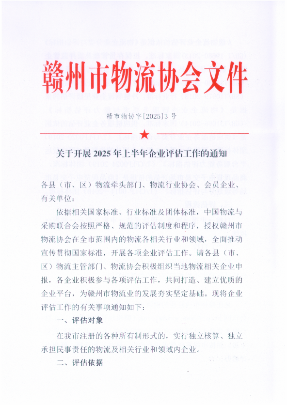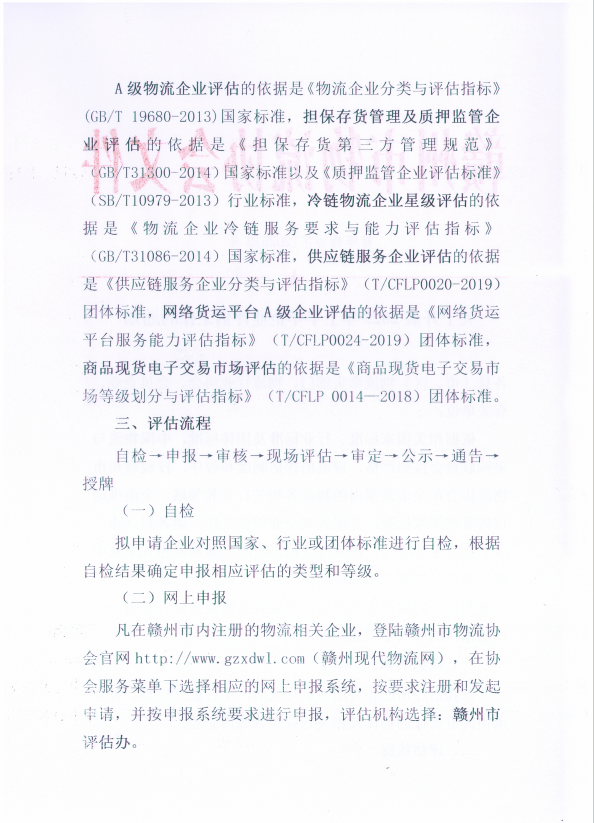 依據(jù)相關(guān)國家標準、行業(yè)標準及團體標準,中國物流與采購聯(lián)合會按照嚴格、規(guī)范的評估制度和程序,授權(quán)贛州市物流協(xié)會在全市范圍內(nèi)的物流各相關(guān)行業(yè)和領(lǐng)域,全面推動宣傳貫徹國家標準,開展各項企業(yè)評估工作。請各縣(市、區(qū))物流主管部門、物流協(xié)會積極組織當(dāng)?shù)匚锪飨嚓P(guān)企業(yè)申報,各企業(yè)積極參與各項評估工作,共同打造、建立優(yōu)質(zhì)的企業(yè)平臺,為贛州市物流業(yè)的發(fā)展夯實堅定基礎(chǔ)。現(xiàn)將企業(yè)評估工作的有關(guān)事項通知如下: