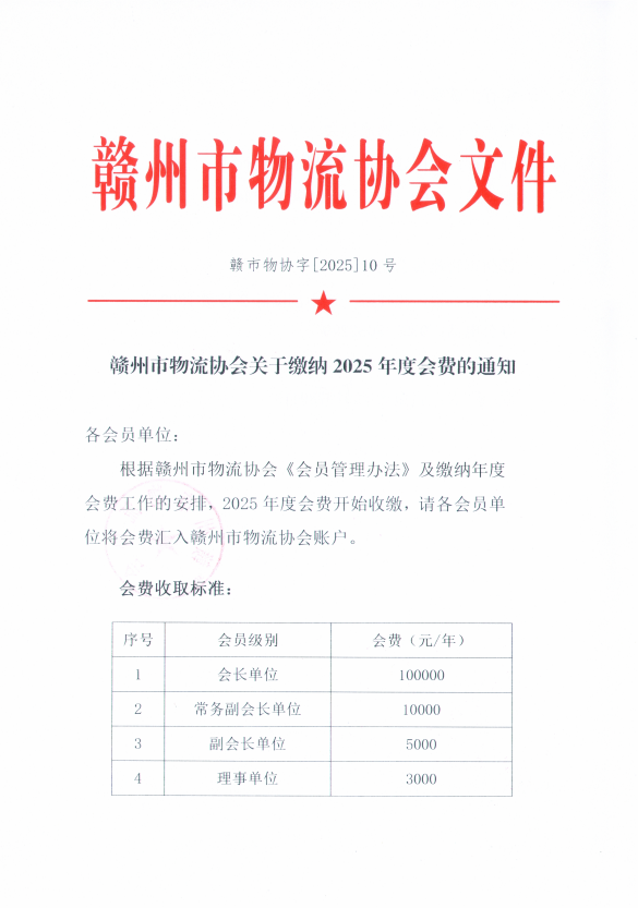贛州市物流協會關于繳納2025年度會費的通知