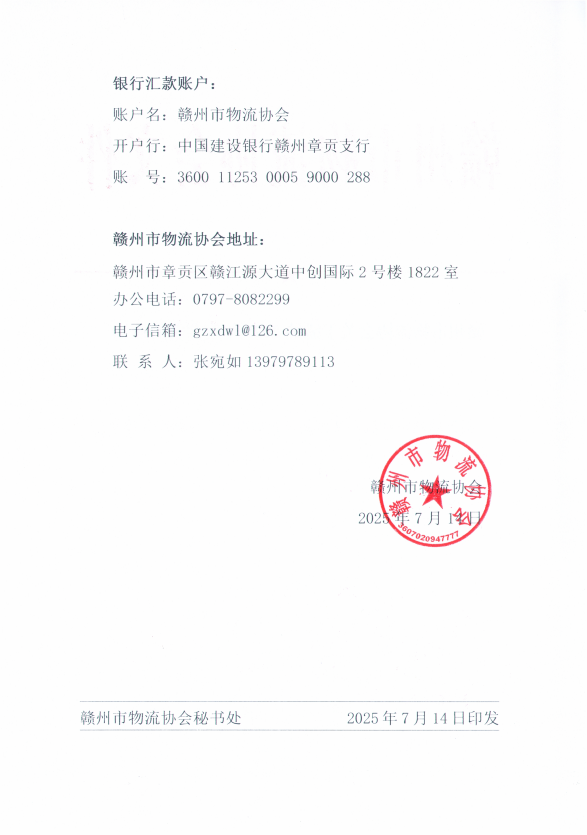 根據贛州市物流協會《會員管理辦法》及繳納年度會費工作的安排,2025年度會費開始收繳,請各會員單位將會費匯入贛州市物流協會賬戶。