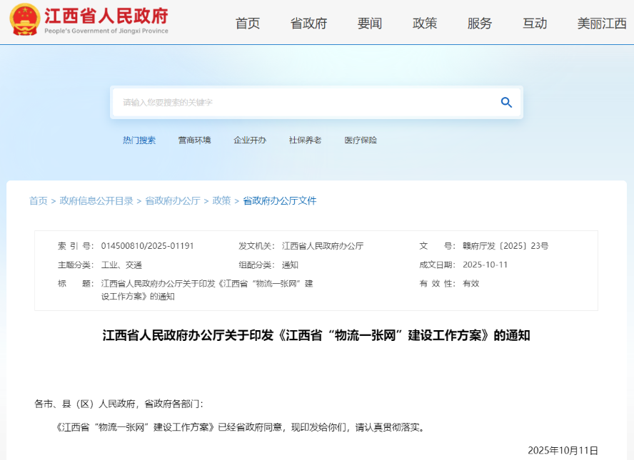 江西省人民政府辦公廳關于印發《江西省“物流一張網”建設工作方案》的通知