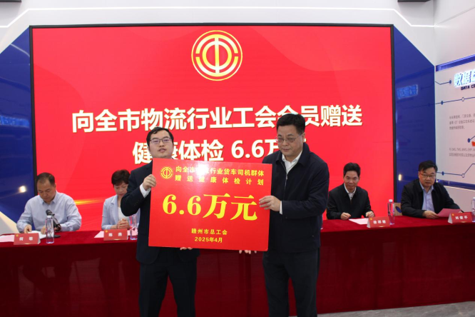 在2025年4月25日贛州市物流行業工會聯合會第一屆會員代表大會第一次會議暨物流行業集中入會儀式上,市總工會黨組副書記、常務副主席劉文杰為贛州市物流行業工會聯合會贈送了總價值6.6萬元的職工健康體檢。