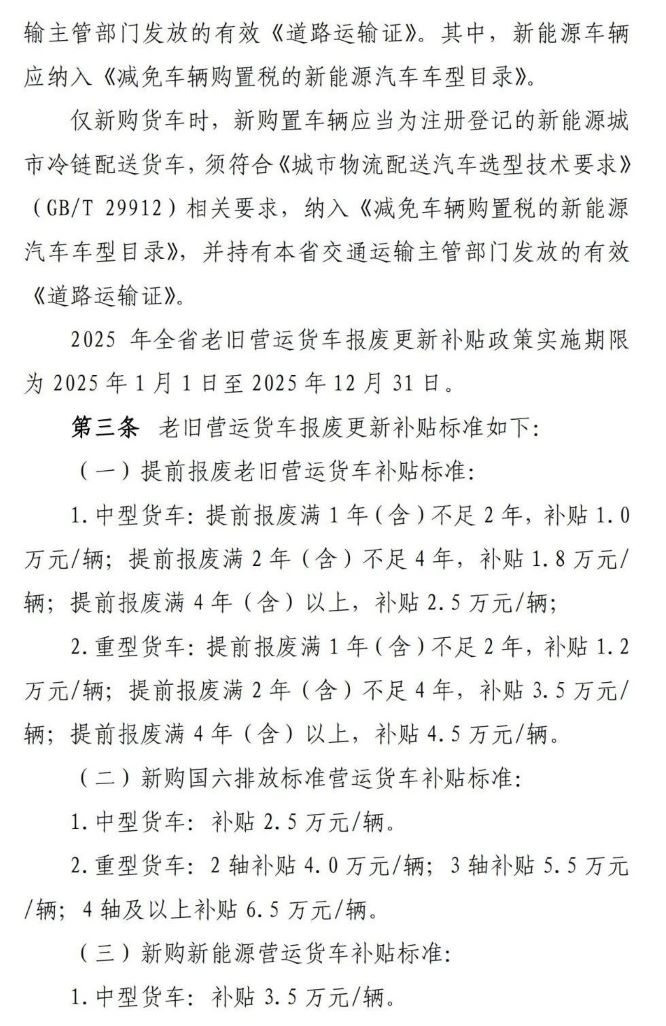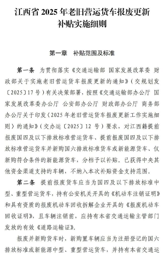 政策動態| 江西省2025年老舊營運貨車報廢更新補貼實施細則